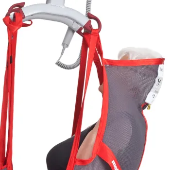 This padded high-back sling provides secure support for users with impaired trunk and head stability. The built-in ergonomic design allows the user to remain in a slightly reclined position, promoting comfort and safety throughout the hoisting process.